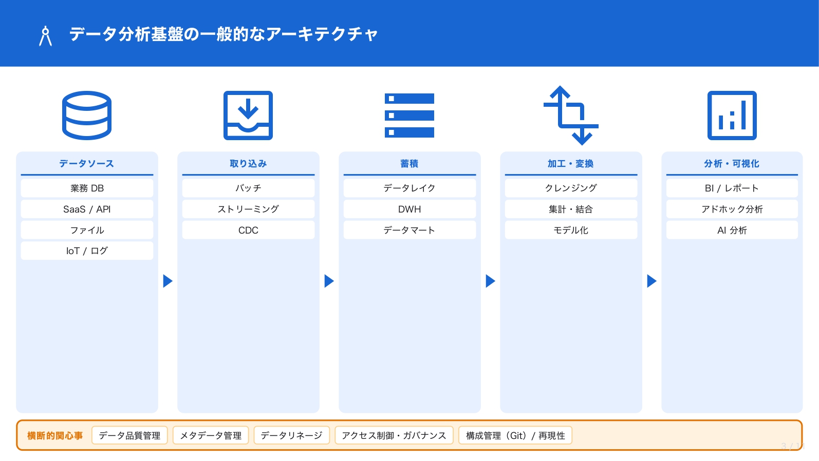 データ分析基盤は一般的に「取り込み → 蓄積 → 加工・変換 → 分析・可視化」のフローで構成され、それを横断的な関心事(ガバナンスや構成管理)が支える形となります 。
