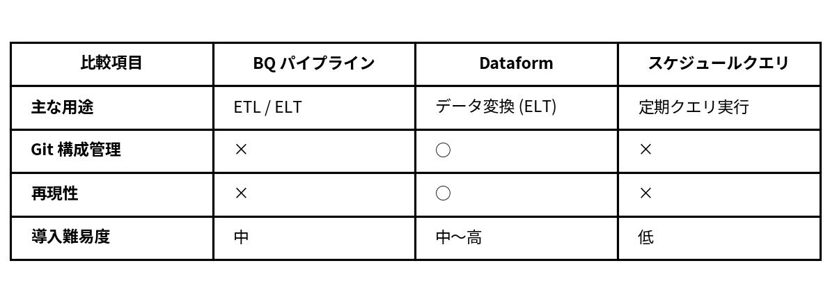 • Dataform: dbtに似たSQLベースの変換管理ツール。Git管理が可能だが、ETL構築にはWorkflows等との組み合わせが必要 。