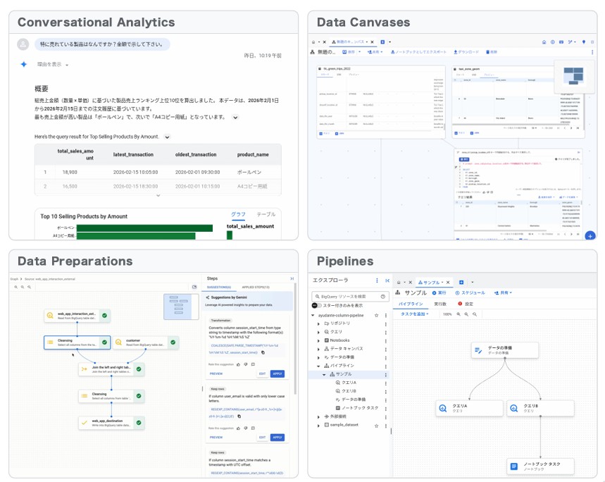 • Conversational Analytics: 自然言語でBQ内のデータを検索・分析できるエージェント機能。