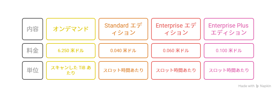オンデマンドに関しては、最大 2,000 個の同時実行スロットが提供されており、これらのスロットは特定のプロジェクトにおける全てのクエリで共有されます。また、 BigQuery には Standard や Enterprise 、 Enterprise Plus など、複数のエディションが用意されており、エディションごとに利用料金が異なるため、自社の状況に合わせて最適なものを選択することが大切です。