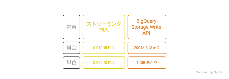 ストリーミング挿入では、挿入に成功した行が課金対象となり、最小 1 KB で各行が計算される仕組みとなっています。また、 BigQuery Storage Write API を使用する際、 BigQuery に読み込まれたデータには、 BigQuery ストレージの料金または Cloud Storage ( Google Cloud に搭載されているストレージサービス)の料金が適用されます。