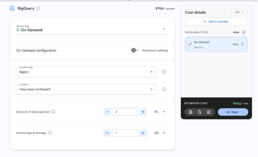 どれだけ高性能なツールでも、料金が高ければ多くのユーザーに支持されることはありません。 BigQuery には多彩な機能が搭載されていますが、利用料金は「 1 テラバイトあたり約 500 円」(東京リージョン)となっており、比較的リーズナブルな価格設定だと言えるでしょう。また、 Google 公式サイト上で公開されている料金計算ツールを使えば、料金の目安を事前に見積ることが可能なため、想定外の高額請求の回避に繋がります。