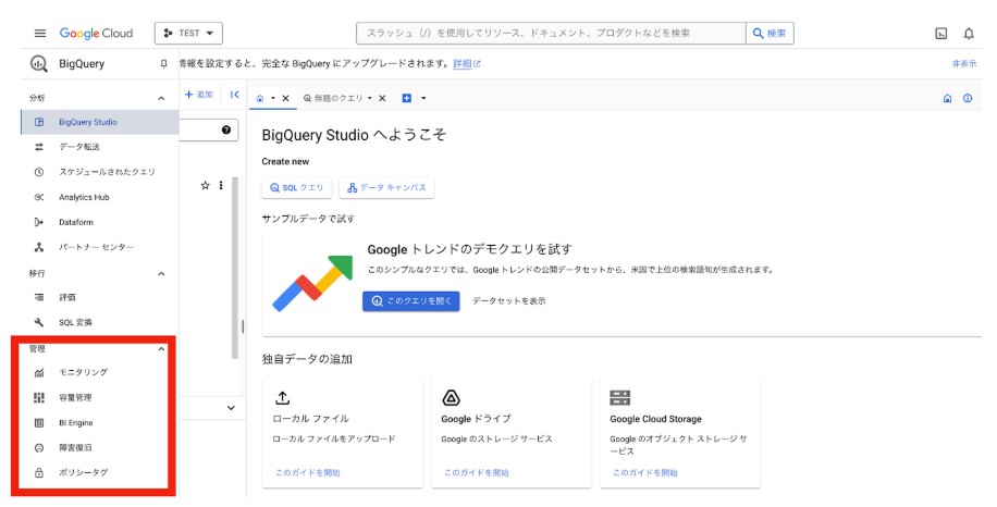 なお、画面左側のメニューを開くと、モニタリングや容量管理、ポリシータグなど、様々な管理機能を利用することも可能です。無料版 Gmail のアカウントでも BigQuery へログインできるため、操作性を確認したい方は気軽に試してみることをおすすめします。