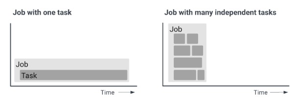 また、 Cloud Run ジョブはコマンドラインから「 gcloud CLI 」を使用してジョブを実行したり、定期的なジョブをスケジュールしたりすることで実行できます。通常、スクリプトやツールを実行するためには、コード実行のための 1 つのインスタンスを開始しますが、配列ジョブ(独立した同一のインスタンスを複数並行)を用いて開始することも可能です。