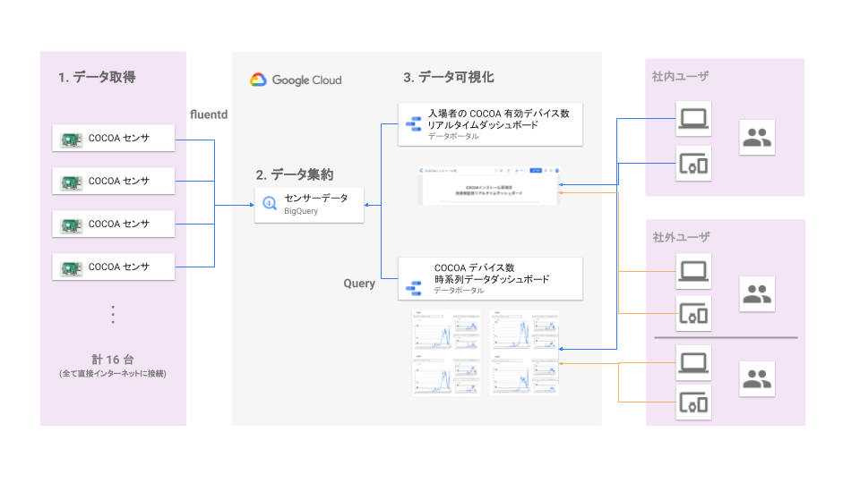 また、 COCOA のインストールを判定するセンサーデバイスはシングルボードコンピュータをベースに開発しており、各センサーデバイスはインターネットを介して BigQuery に直接データを書き込む仕組みになっています。